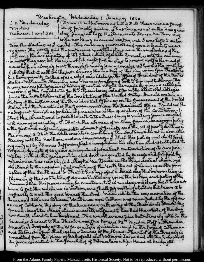 View full, authoritative transcriptions with page images of the diaries at John Quincy Adams Digital Diary part of the Primary Source Cooperative at the MHS.