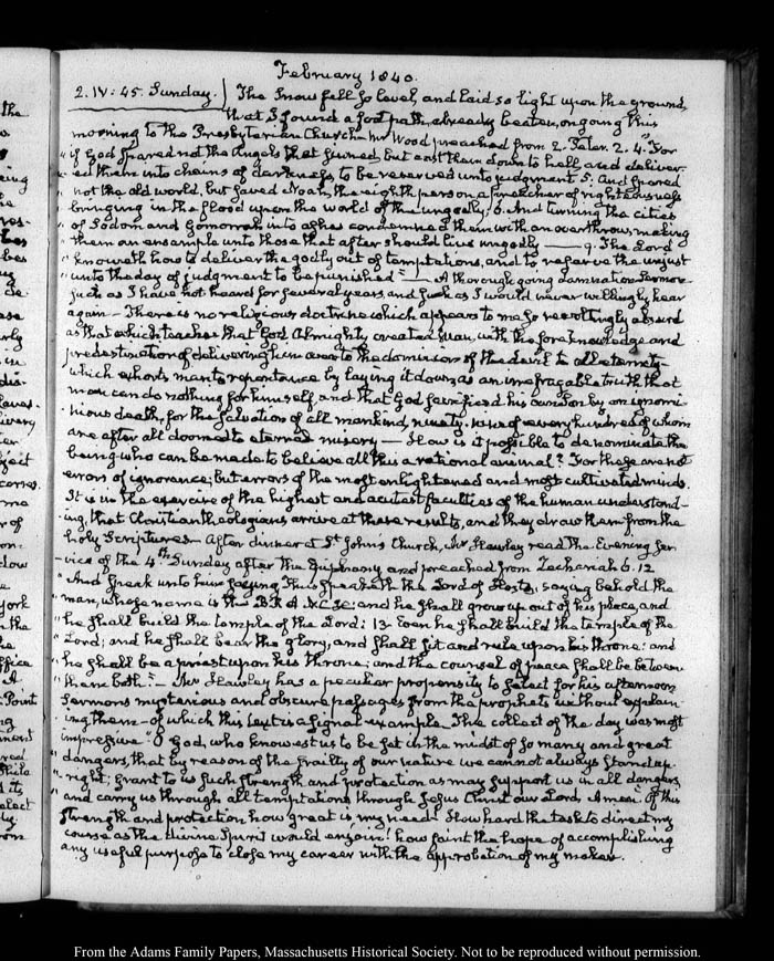 View full, authoritative transcriptions with page images of the diaries at John Quincy Adams Digital Diary part of the Primary Source Cooperative at the MHS.