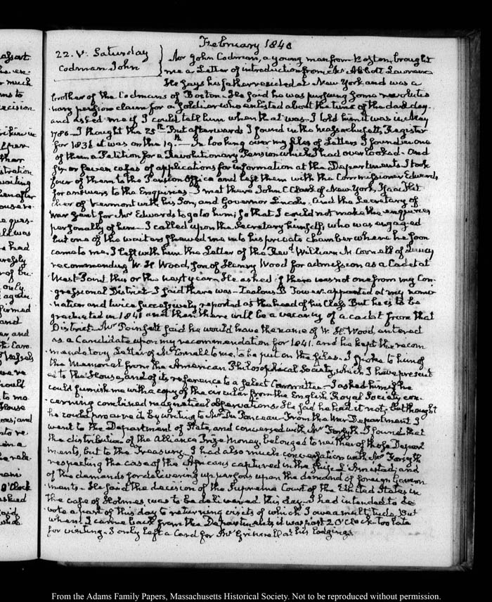 View full, authoritative transcriptions with page images of the diaries at John Quincy Adams Digital Diary part of the Primary Source Cooperative at the MHS.