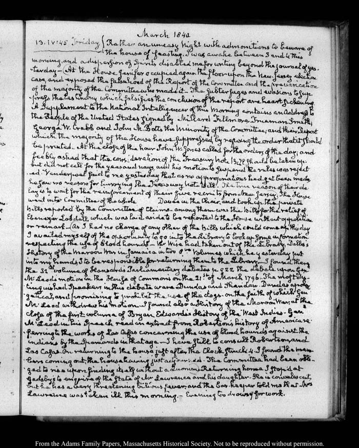 View full, authoritative transcriptions with page images of the diaries at John Quincy Adams Digital Diary part of the Primary Source Cooperative at the MHS.