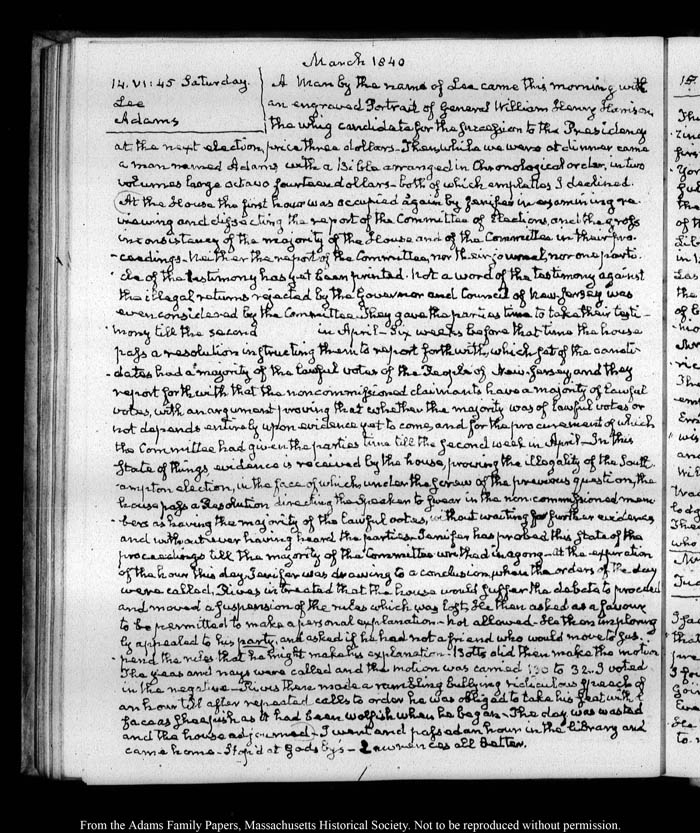 View full, authoritative transcriptions with page images of the diaries at John Quincy Adams Digital Diary part of the Primary Source Cooperative at the MHS.