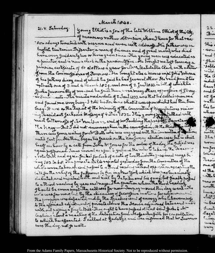 View full, authoritative transcriptions with page images of the diaries at John Quincy Adams Digital Diary part of the Primary Source Cooperative at the MHS.