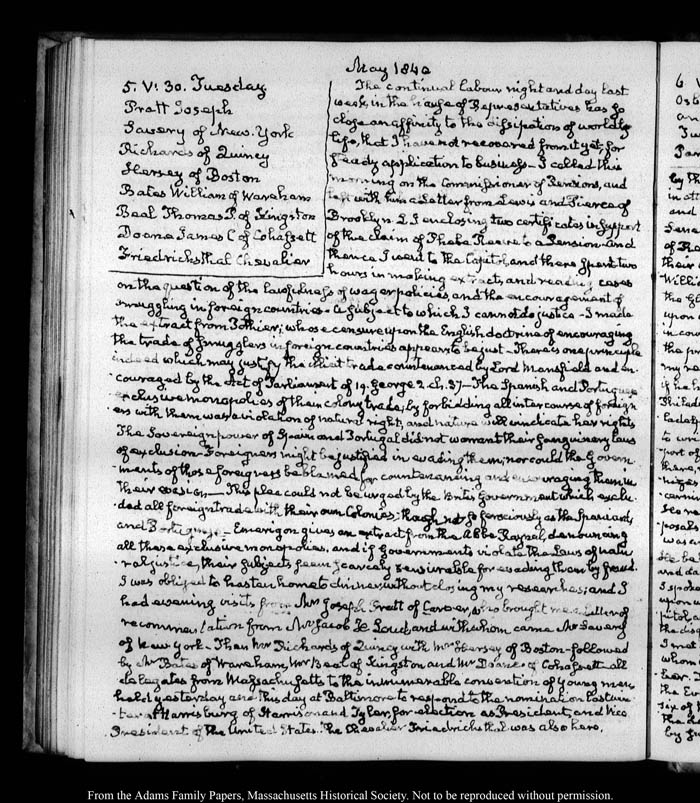 View full, authoritative transcriptions with page images of the diaries at John Quincy Adams Digital Diary part of the Primary Source Cooperative at the MHS.