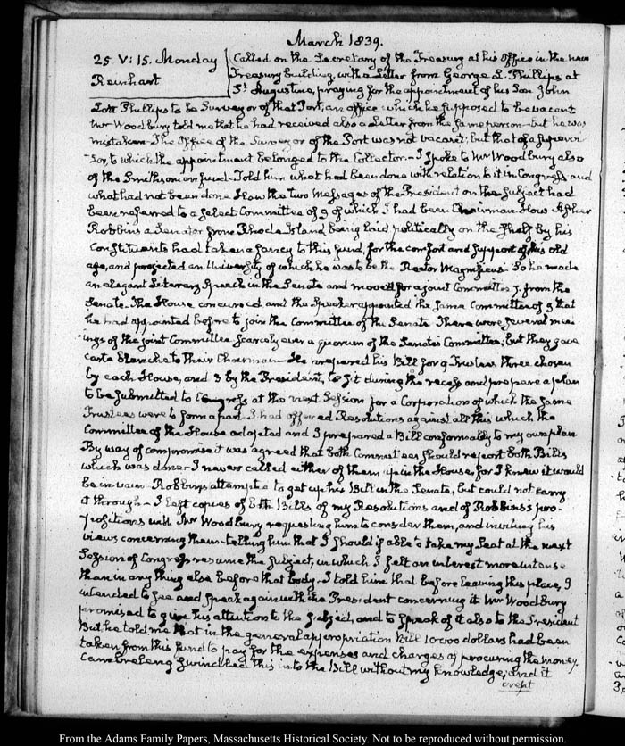 View full, authoritative transcriptions with page images of the diaries at John Quincy Adams Digital Diary part of the Primary Source Cooperative at the MHS.