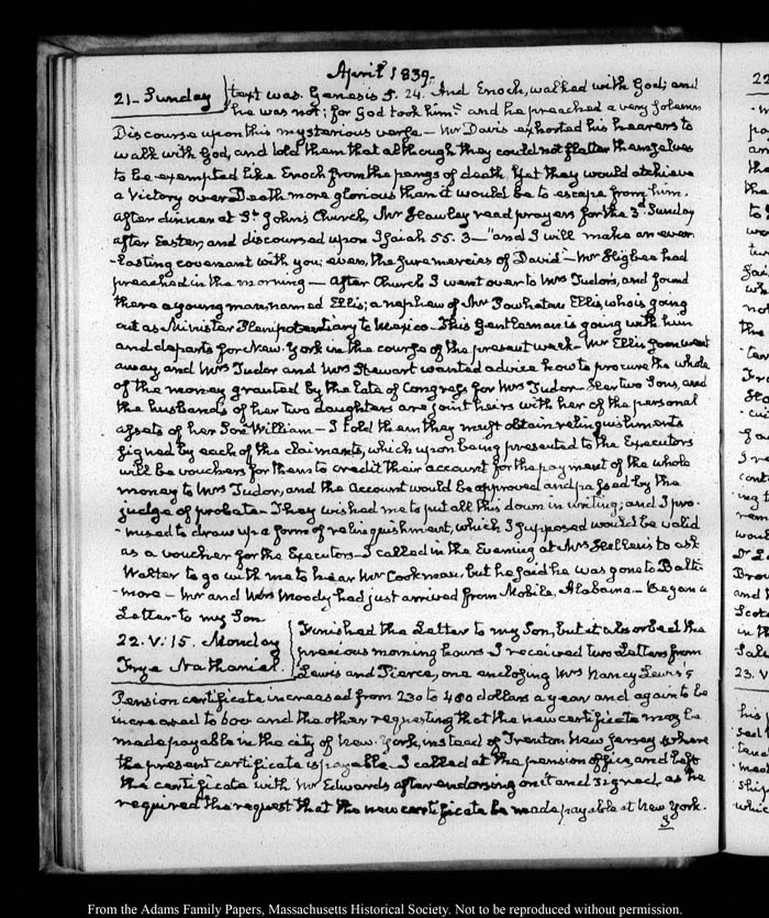 View full, authoritative transcriptions with page images of the diaries at John Quincy Adams Digital Diary part of the Primary Source Cooperative at the MHS.