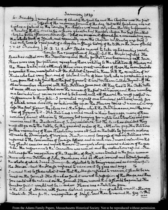 View full, authoritative transcriptions with page images of the diaries at John Quincy Adams Digital Diary part of the Primary Source Cooperative at the MHS.