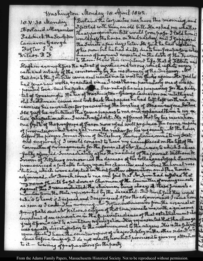 View full, authoritative transcriptions with page images of the diaries at John Quincy Adams Digital Diary part of the Primary Source Cooperative at the MHS.