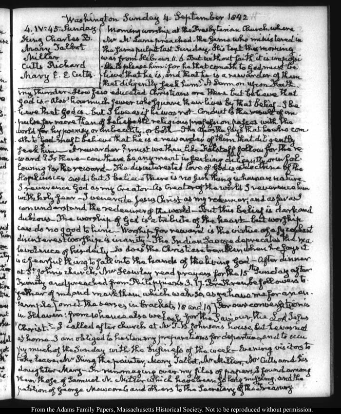 View full, authoritative transcriptions with page images of the diaries at John Quincy Adams Digital Diary part of the Primary Source Cooperative at the MHS.