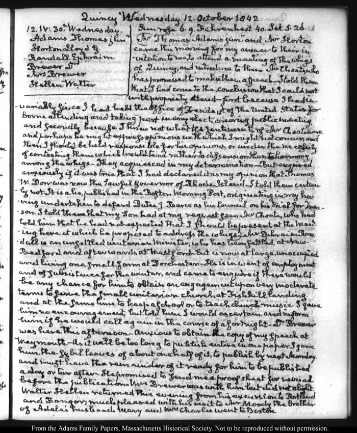View full, authoritative transcriptions with page images of the diaries at John Quincy Adams Digital Diary part of the Primary Source Cooperative at the MHS.