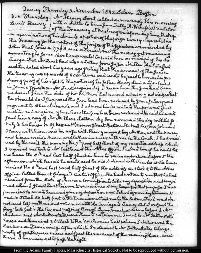 View full, authoritative transcriptions with page images of the diaries at John Quincy Adams Digital Diary part of the Primary Source Cooperative at the MHS.