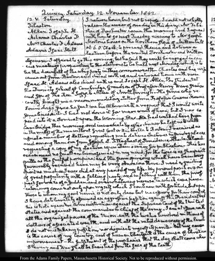 View full, authoritative transcriptions with page images of the diaries at John Quincy Adams Digital Diary part of the Primary Source Cooperative at the MHS.