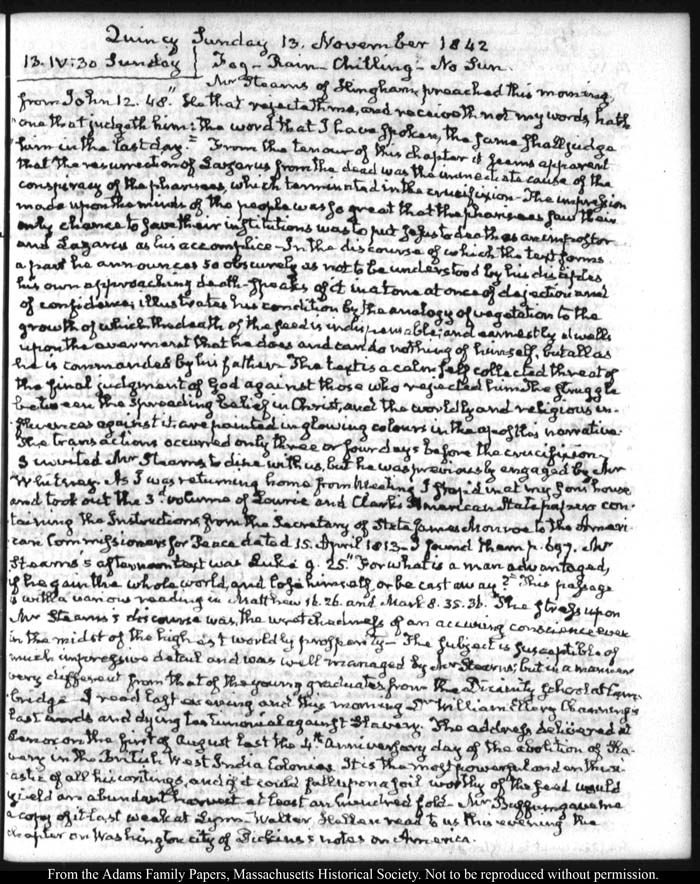 View full, authoritative transcriptions with page images of the diaries at John Quincy Adams Digital Diary part of the Primary Source Cooperative at the MHS.