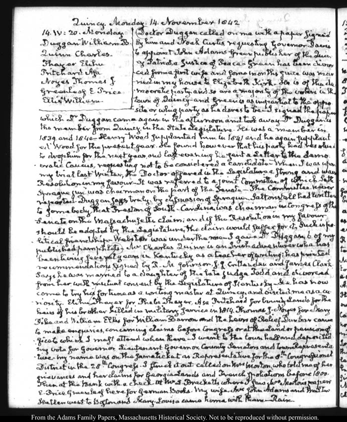 View full, authoritative transcriptions with page images of the diaries at John Quincy Adams Digital Diary part of the Primary Source Cooperative at the MHS.