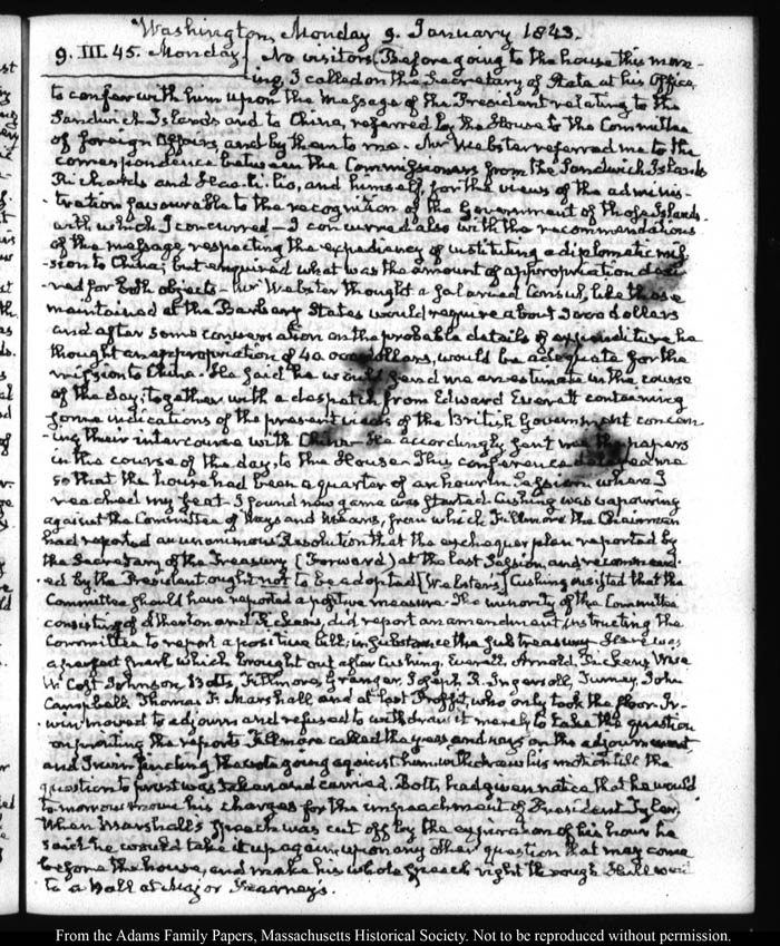 View full, authoritative transcriptions with page images of the diaries at John Quincy Adams Digital Diary part of the Primary Source Cooperative at the MHS.