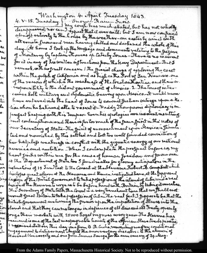 View full, authoritative transcriptions with page images of the diaries at John Quincy Adams Digital Diary part of the Primary Source Cooperative at the MHS.