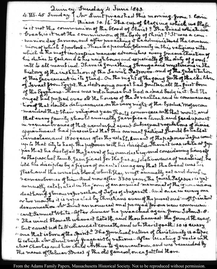 View full, authoritative transcriptions with page images of the diaries at John Quincy Adams Digital Diary part of the Primary Source Cooperative at the MHS.