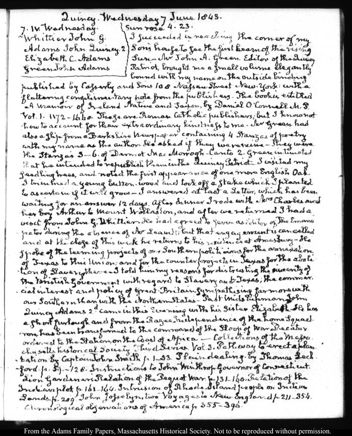 View full, authoritative transcriptions with page images of the diaries at John Quincy Adams Digital Diary part of the Primary Source Cooperative at the MHS.