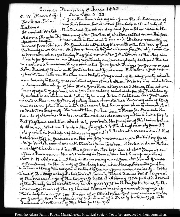 View full, authoritative transcriptions with page images of the diaries at John Quincy Adams Digital Diary part of the Primary Source Cooperative at the MHS.