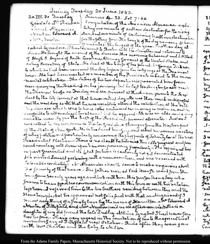 View full, authoritative transcriptions with page images of the diaries at John Quincy Adams Digital Diary part of the Primary Source Cooperative at the MHS.