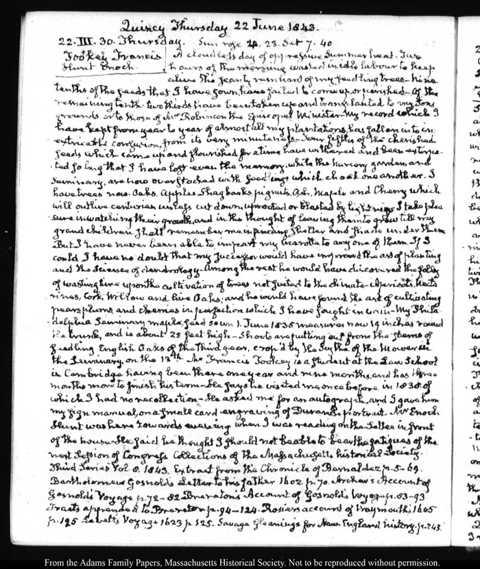View full, authoritative transcriptions with page images of the diaries at John Quincy Adams Digital Diary part of the Primary Source Cooperative at the MHS.