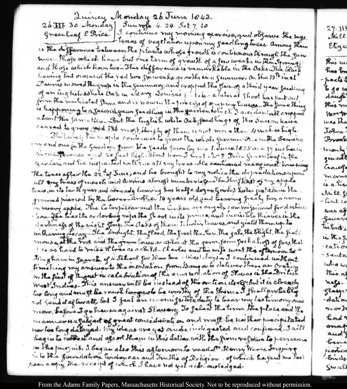 View full, authoritative transcriptions with page images of the diaries at John Quincy Adams Digital Diary part of the Primary Source Cooperative at the MHS.