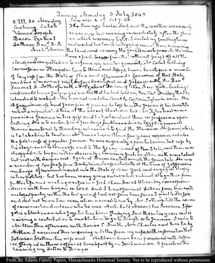 View full, authoritative transcriptions with page images of the diaries at John Quincy Adams Digital Diary part of the Primary Source Cooperative at the MHS.