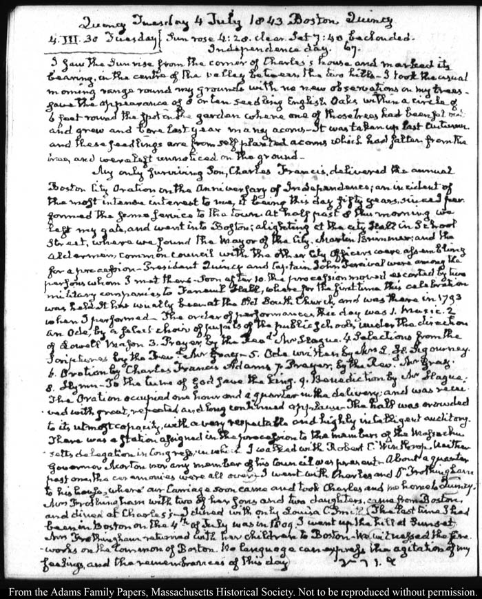 View full, authoritative transcriptions with page images of the diaries at John Quincy Adams Digital Diary part of the Primary Source Cooperative at the MHS.