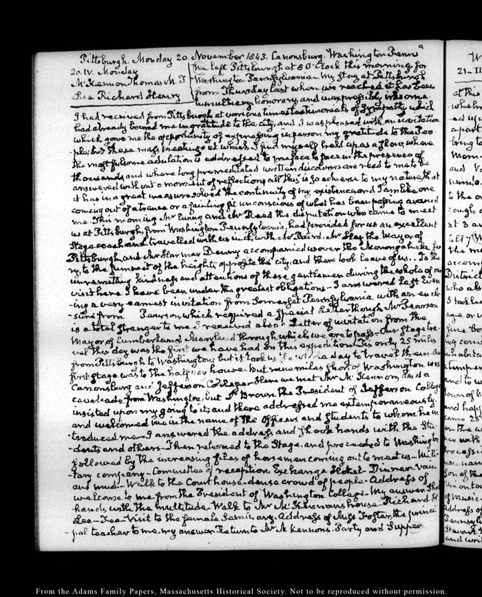 View full, authoritative transcriptions with page images of the diaries at John Quincy Adams Digital Diary part of the Primary Source Cooperative at the MHS.