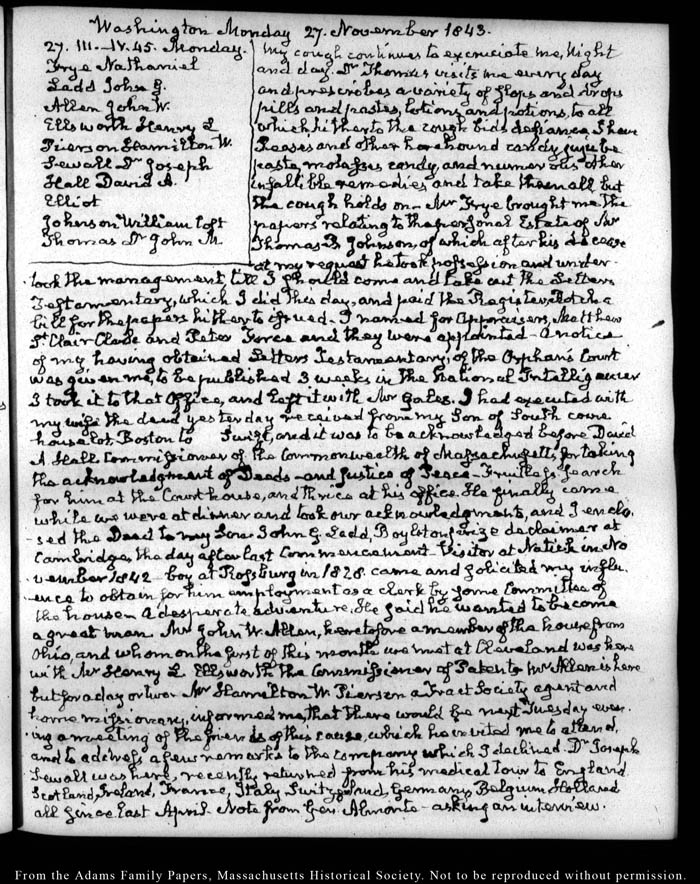 View full, authoritative transcriptions with page images of the diaries at John Quincy Adams Digital Diary part of the Primary Source Cooperative at the MHS.
