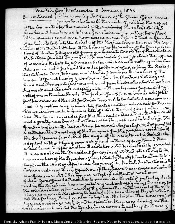 View full, authoritative transcriptions with page images of the diaries at John Quincy Adams Digital Diary part of the Primary Source Cooperative at the MHS.