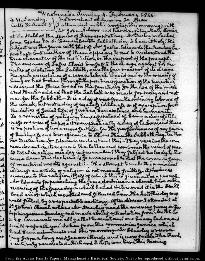 View full, authoritative transcriptions with page images of the diaries at John Quincy Adams Digital Diary part of the Primary Source Cooperative at the MHS.