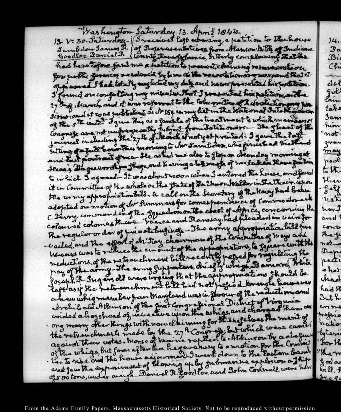 View full, authoritative transcriptions with page images of the diaries at John Quincy Adams Digital Diary part of the Primary Source Cooperative at the MHS.