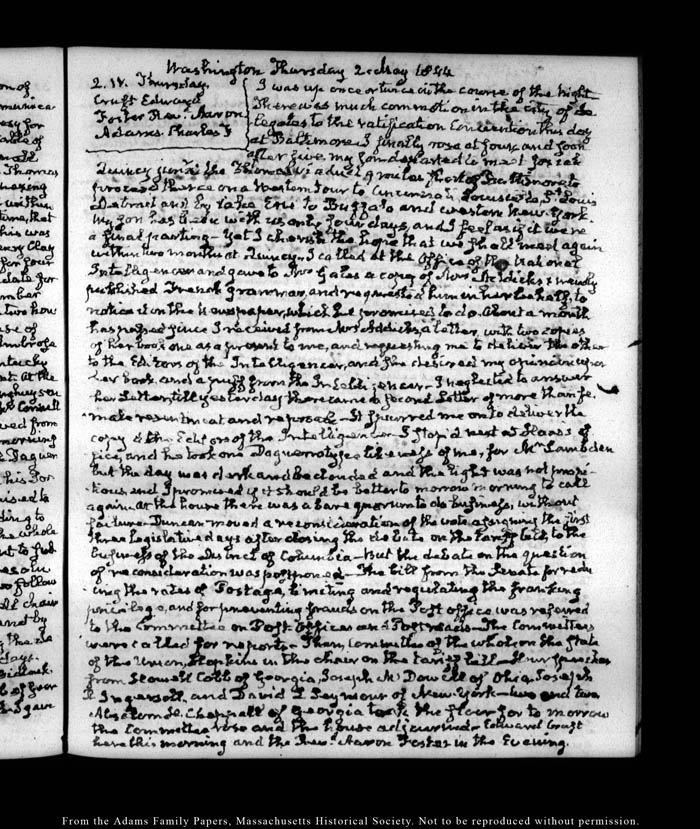 View full, authoritative transcriptions with page images of the diaries at John Quincy Adams Digital Diary part of the Primary Source Cooperative at the MHS.