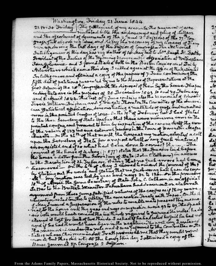 View full, authoritative transcriptions with page images of the diaries at John Quincy Adams Digital Diary part of the Primary Source Cooperative at the MHS.
