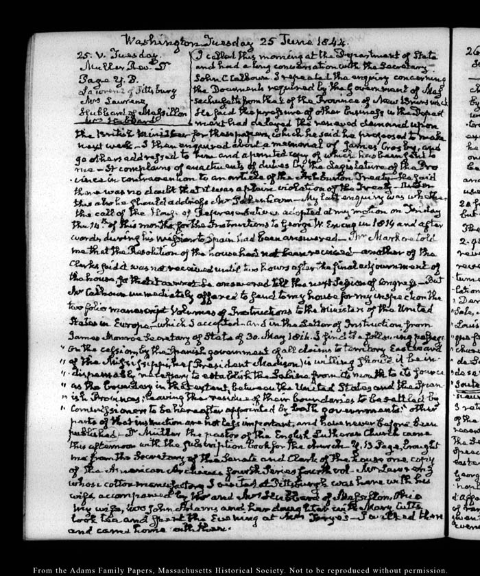 View full, authoritative transcriptions with page images of the diaries at John Quincy Adams Digital Diary part of the Primary Source Cooperative at the MHS.