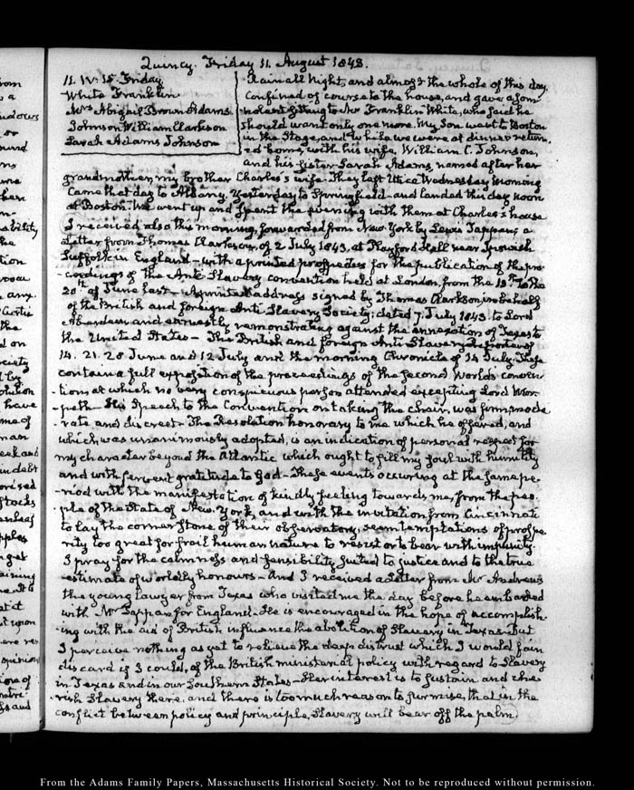 View full, authoritative transcriptions with page images of the diaries at John Quincy Adams Digital Diary part of the Primary Source Cooperative at the MHS.