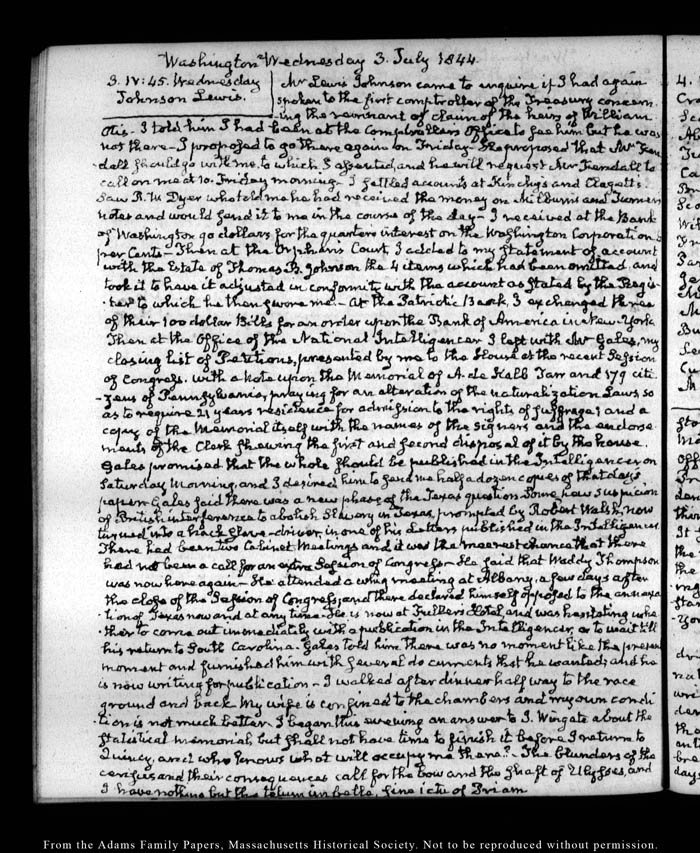 View full, authoritative transcriptions with page images of the diaries at John Quincy Adams Digital Diary part of the Primary Source Cooperative at the MHS.