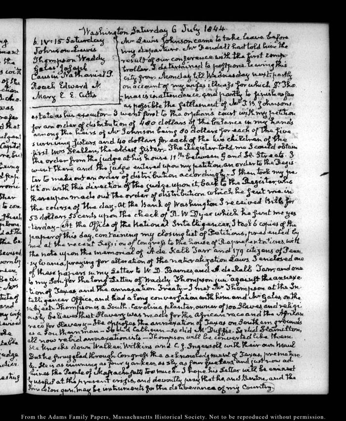 View full, authoritative transcriptions with page images of the diaries at John Quincy Adams Digital Diary part of the Primary Source Cooperative at the MHS.