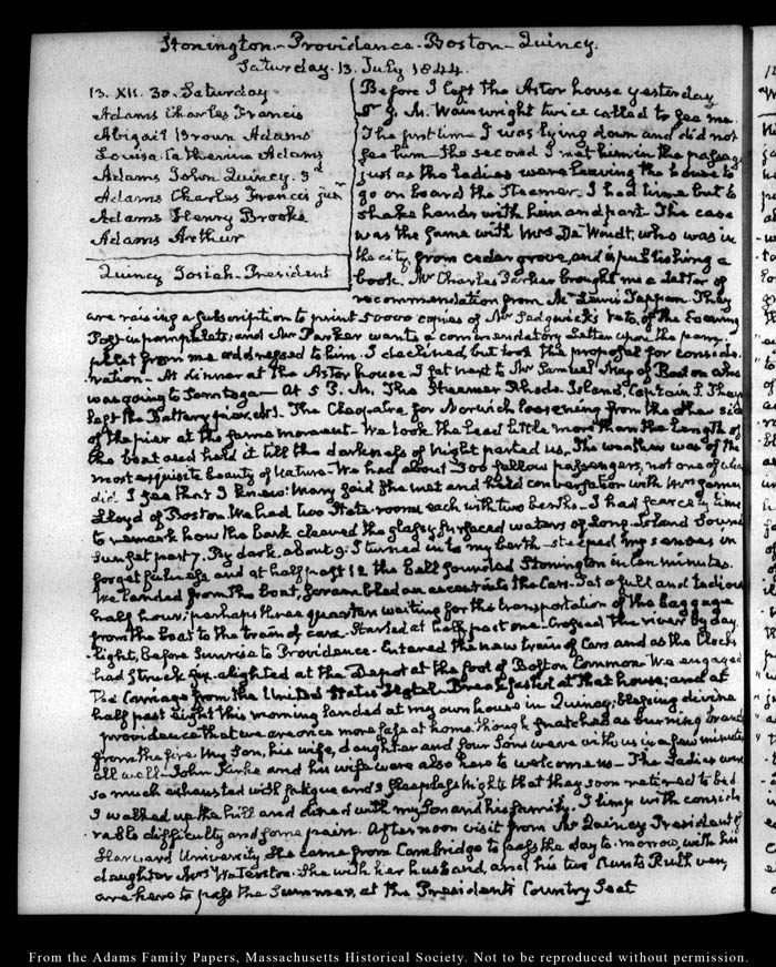 View full, authoritative transcriptions with page images of the diaries at John Quincy Adams Digital Diary part of the Primary Source Cooperative at the MHS.