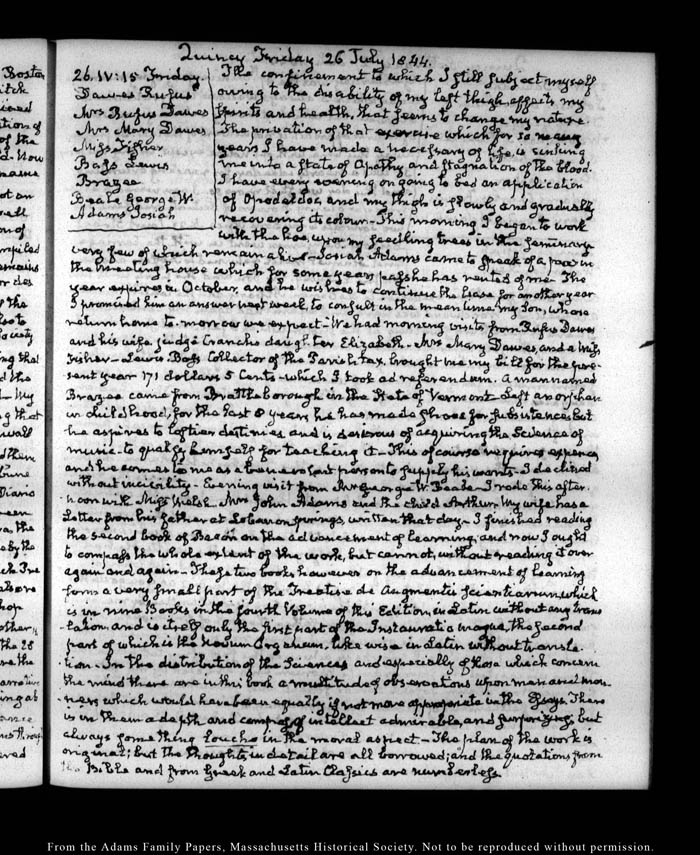 View full, authoritative transcriptions with page images of the diaries at John Quincy Adams Digital Diary part of the Primary Source Cooperative at the MHS.