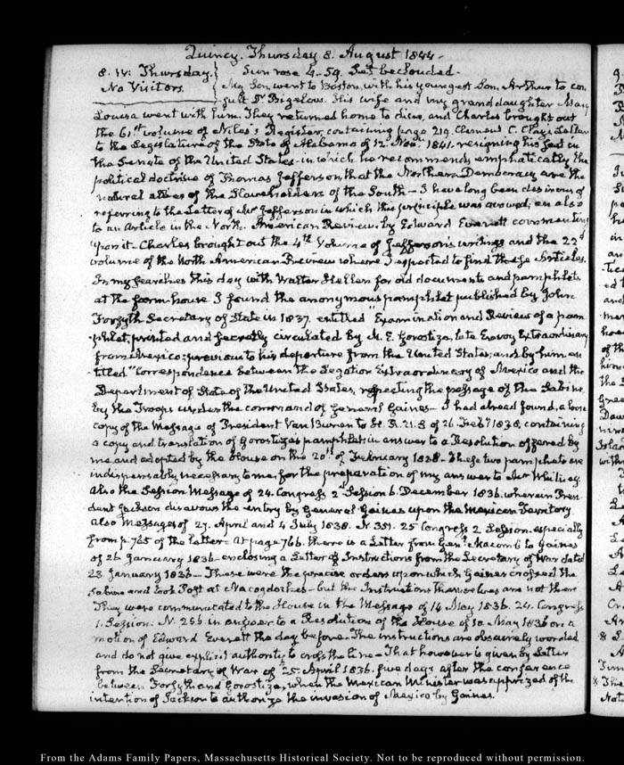 View full, authoritative transcriptions with page images of the diaries at John Quincy Adams Digital Diary part of the Primary Source Cooperative at the MHS.
