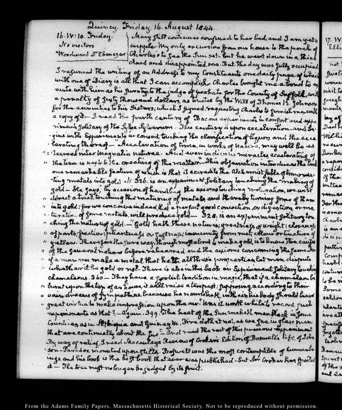 View full, authoritative transcriptions with page images of the diaries at John Quincy Adams Digital Diary part of the Primary Source Cooperative at the MHS.