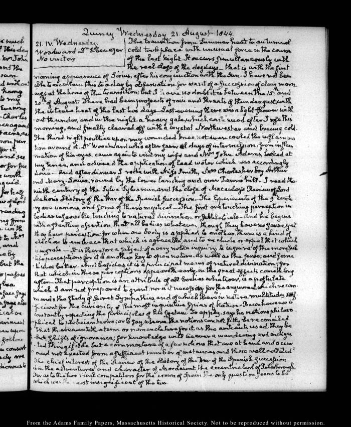 View full, authoritative transcriptions with page images of the diaries at John Quincy Adams Digital Diary part of the Primary Source Cooperative at the MHS.