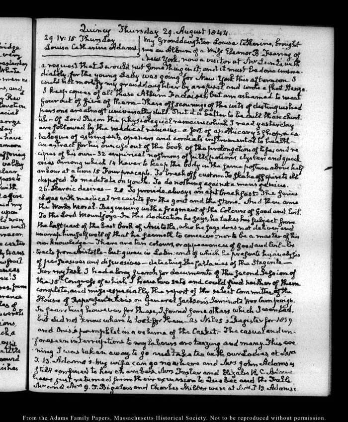 View full, authoritative transcriptions with page images of the diaries at John Quincy Adams Digital Diary part of the Primary Source Cooperative at the MHS.