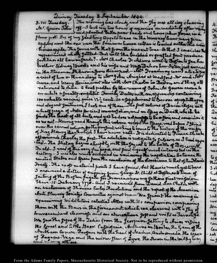 View full, authoritative transcriptions with page images of the diaries at John Quincy Adams Digital Diary part of the Primary Source Cooperative at the MHS.