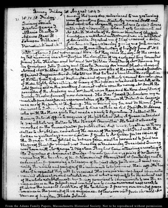View full, authoritative transcriptions with page images of the diaries at John Quincy Adams Digital Diary part of the Primary Source Cooperative at the MHS.