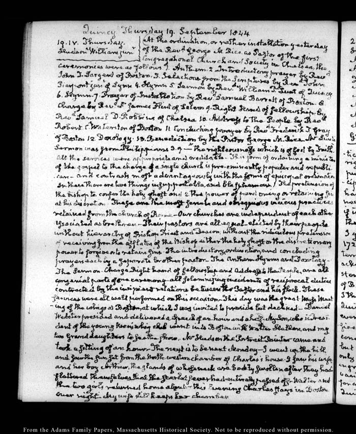 View full, authoritative transcriptions with page images of the diaries at John Quincy Adams Digital Diary part of the Primary Source Cooperative at the MHS.