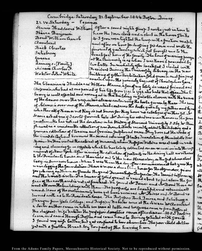 View full, authoritative transcriptions with page images of the diaries at John Quincy Adams Digital Diary part of the Primary Source Cooperative at the MHS.