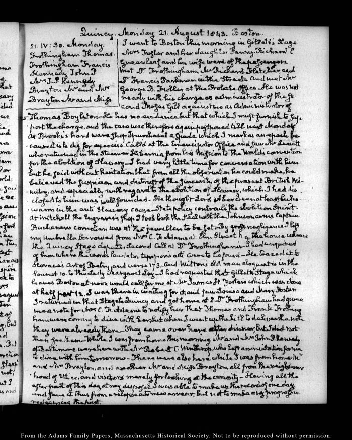View full, authoritative transcriptions with page images of the diaries at John Quincy Adams Digital Diary part of the Primary Source Cooperative at the MHS.