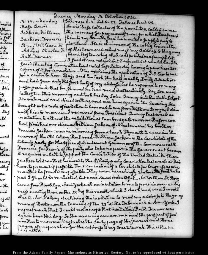 View full, authoritative transcriptions with page images of the diaries at John Quincy Adams Digital Diary part of the Primary Source Cooperative at the MHS.